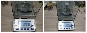 - 重復剛才的步驟擦拭干剛才測的2號陶瓷材料,確保不沾有一點水。把陶瓷材料放在稱重架上,重復前面兩個操作步驟。得出以下的測量結(jié)果。