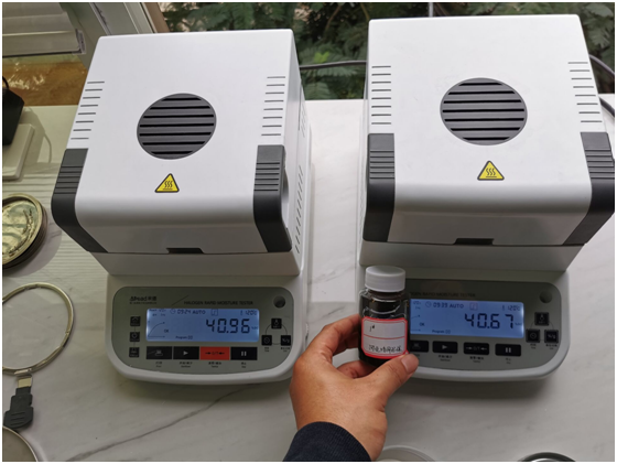 測(cè)試目的:聚天冬氨酸是一種氨基酸聚合物,天然存在于蝸牛和軟體動(dòng)物殼內(nèi),聚天冬氨酸是生物降解性好的、環(huán)境友好型化學(xué)品。聚天冬氨酸用途廣泛。在水處理、醫(yī)藥、農(nóng)業(yè)、日化等領(lǐng)域都能找到它的用途。聚天冬氨酸作為一種新型綠色水處理劑,應(yīng)用于工業(yè)循環(huán)冷卻水處理領(lǐng)域;聚天冬氨酸本身不是肥料,但它可以作肥料增效劑;聚天冬氨酸同時(shí)具有分散作用并可有效防止金屬設(shè)備的腐蝕等等。但是合格的聚天冬氨酸溶液固含量應(yīng)在40%以上,我們將通過(guò)兩臺(tái)固含量測(cè)試儀同時(shí)測(cè)試對(duì)比,驗(yàn)證三瓶聚天冬氨酸試劑中的可溶固體含量。