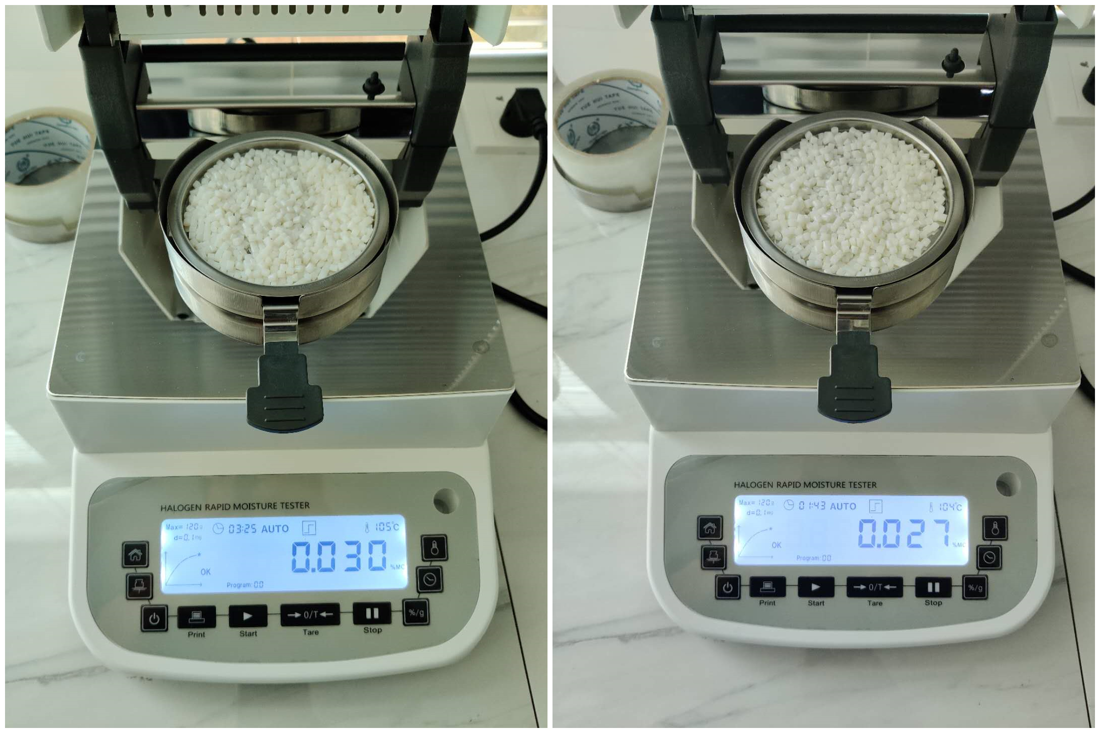 測試目的:水分含量是影響塑料加工工藝、產(chǎn)品外觀和產(chǎn)品特性的一個重要因素,在注塑過程中,如果使用含水量過高的塑料顆粒進行生產(chǎn),會使最終產(chǎn)品出現(xiàn)開裂、反光、抗沖擊性能和拉伸強度降低等問題,影響產(chǎn)品質(zhì)量。所以檢測塑料顆粒的水分是塑料生產(chǎn)過程中一道重要的步驟。