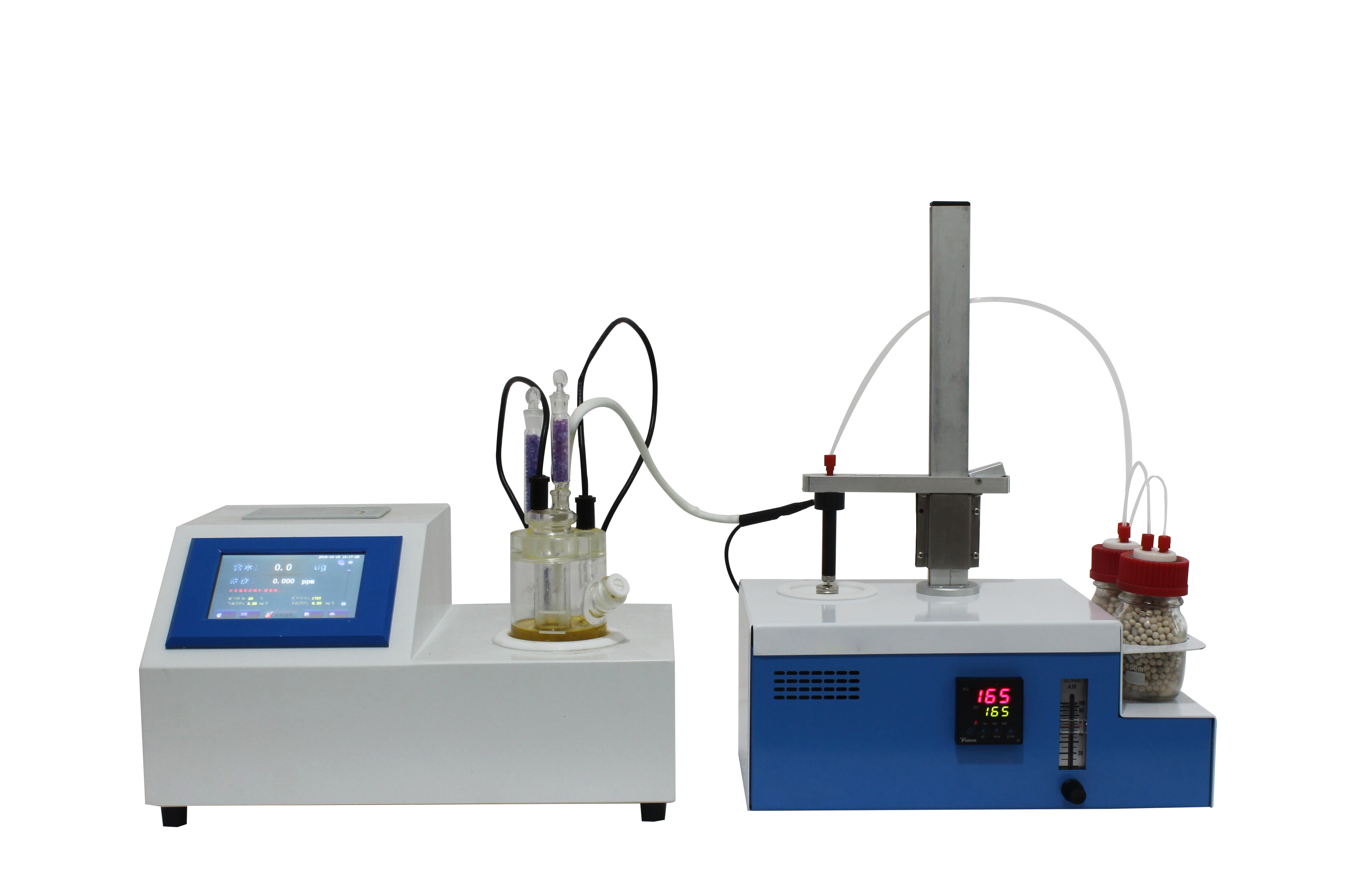 KSQL-310S-KHF 卡氏加熱爐主要分為兩個部分,第一個是V-310S庫侖法卡爾費休水分測定儀,第二個是KHF-100卡氏加熱爐,由這兩部分組成了完整的KSQL-310S-KHF 鋰電池材料專用卡氏水分測定儀。