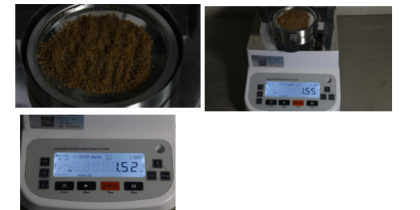 測試樣品1:用實驗勺提取4克藥品,置于不銹鋼托盤中,用實驗勺將藥品平鋪平均,溫度設置 105℃用儀器進行加熱,約4分鐘后檢測結(jié)束,檢測數(shù)據(jù)顯示1.55%;