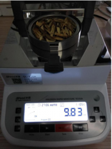 - 為了檢驗這個數(shù)據(jù)是否精確,我們進行,在進行第二次測試過程前先等待甘草水分儀降溫,待水分儀本身冷卻至40度以下時,這次我們?nèi)?克多甘草就好,將甘草平鋪均勻,這次我們還是把溫度設(shè)置在105℃,按“START”鍵開始測試,27分06秒后檢測結(jié)束,檢測數(shù)據(jù)顯示9.83%;