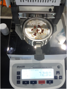 用鑷子提取8克豬肉肉末,置于不銹鋼托盤(pán)中,用鑷子將牛肉肉末平鋪均勻,溫度設(shè)置145℃用儀器進(jìn)行加熱,檢測(cè)結(jié)束,檢測(cè)數(shù)據(jù)顯示72.65%;為了檢測(cè)儀器的精確性,待儀器溫度降至50℃以下時(shí)進(jìn)行第二次測(cè)量,用實(shí)驗(yàn)勺提取8克豬肉肉末,置于不銹鋼托盤(pán)中,用實(shí)驗(yàn)勺將面粉平鋪均勻,溫度設(shè)置145℃用儀器進(jìn)行加熱,后檢測(cè)結(jié)束,檢測(cè)數(shù)據(jù)顯示72.90%;?用實(shí)驗(yàn)勺提取8克豬肉肉末,置于不銹鋼托盤(pán)中,用實(shí)驗(yàn)勺將豬肉平鋪均勻,溫度設(shè)置150℃用儀器進(jìn)行加熱后檢測(cè)結(jié)束,檢測(cè)數(shù)據(jù)顯示72.82%。實(shí)驗(yàn)結(jié)果所得數(shù)值較為準(zhǔn)確,儀器檢測(cè)精度較高。