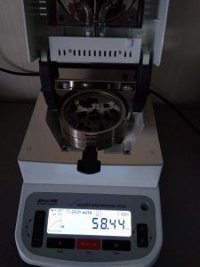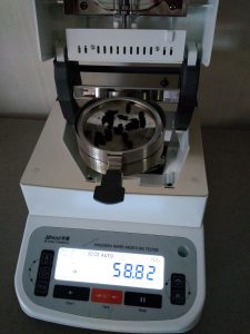 測試話梅干碎:為了使測試過程中話梅干水分儀將話梅干烘干烘透,我們將話梅干用剪刀剪成碎片,攤成分散狀,以便溫度能滲透進(jìn)去。取3克左右話梅干碎均勻鋪撒在不銹鋼托盤中,用鑷子將話梅干碎平鋪均勻,為使話梅干水分完全烘干并且不變焦,我們將溫度設(shè)置在160℃,按“START”鍵開始測試,25分04秒后檢測結(jié)束,檢測數(shù)據(jù)顯示58.44%;