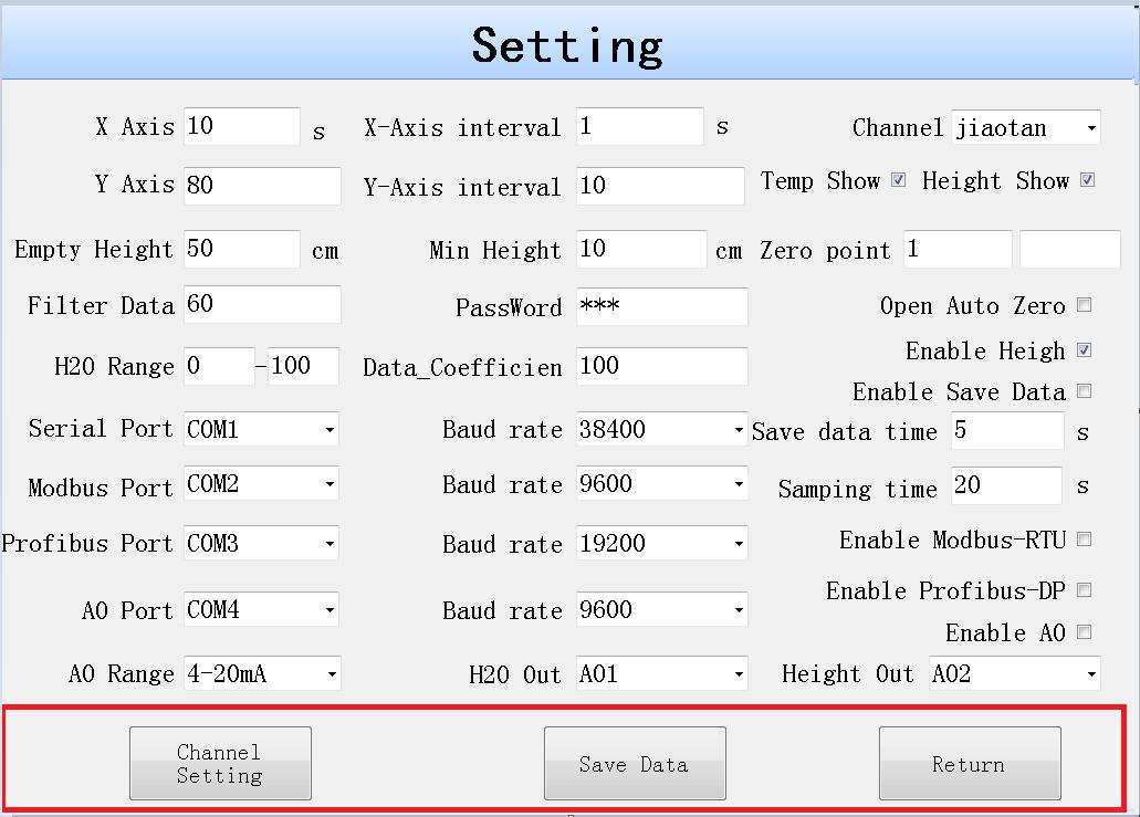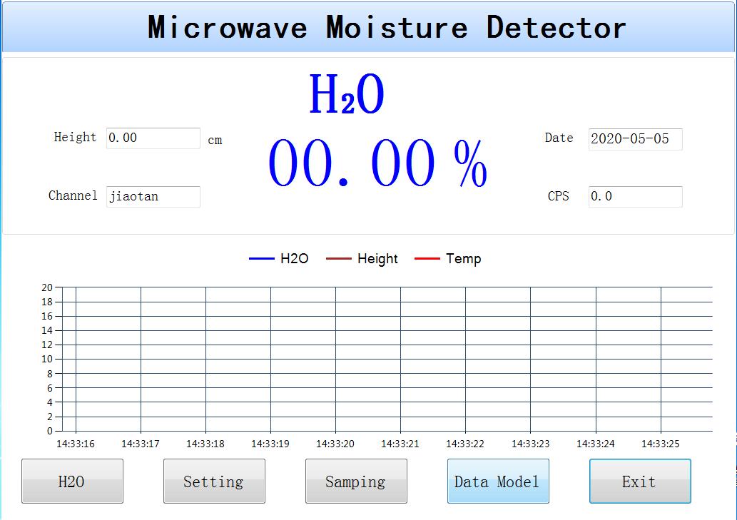 此界面主要顯示四個數(shù)據(jù)值:水分、物料高度、檢測通道和能量值