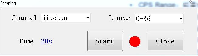 首先選中需要標定的通道和線性。如上圖4.3所示:通道為選擇jiaotan(根據(jù)現(xiàn)場可以選擇新建的通道)?;然后選擇線性為:0-36(根據(jù)實際情況選擇);點Start按鈕,開始啟動取樣。啟動后指示燈變?yōu)榫G色,Time 為采樣倒計時,當此數(shù)據(jù)為0時表示取樣完成。最后點Close關(guān)閉窗體按鈕完成取樣。