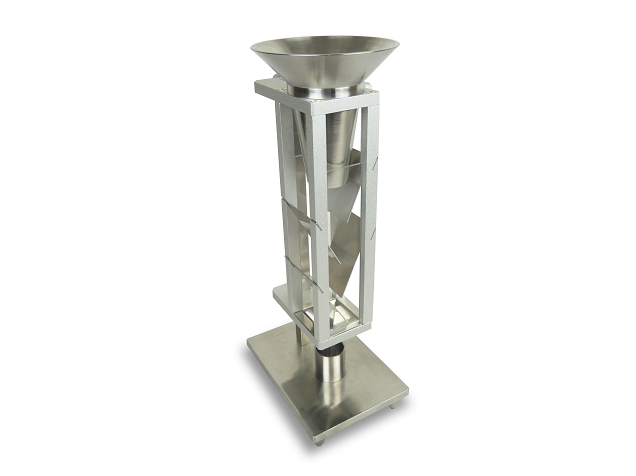 1、上部組合漏斗:由兩個(gè)不銹鋼圓錐形漏斗裝配而成,其間一段圓柱隔開(kāi),并放入一個(gè)孔徑為1.18mm的不銹鋼篩網(wǎng)。