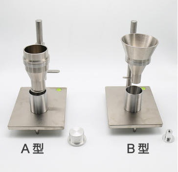 (3)迅速抽開擋料板,讓試驗自由流進(jìn)測量圓筒,用刮板刮去測量圓筒上部多余的試樣并在天平上稱量圓筒中的試樣,精確至0.1克。